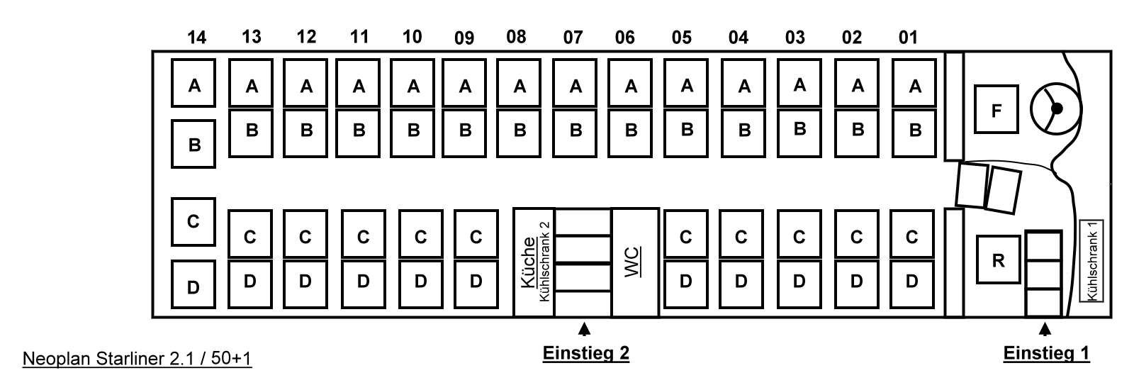 | Länge: | 14,30 m | - Wassertoilette - Anschnallgurte an jedem Sitz - 2 Kühlschränke - Bordküche mit Microwelle und Kaffeeautomat - 230 V Steckdosen mit USB in jeder Sitzreihe - Multimedia Anlage für CD/ DVD/ Bluetooth - Reiseleitermicrofon - WLan ( in Deutschland frei ) - LED Light Thema und Dark Windows - optional ist die Umrüstung auf 57 Plätze möglich | |